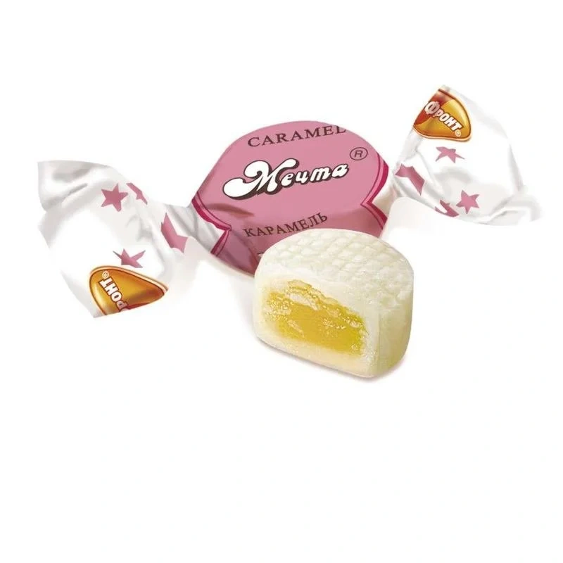 Карамель РотФронт Мечта - одна из самых знаменитых и популярных конфет фабрики Рот Фронт. Гладкая белая карамель с мелким клетчатым орнаментом и насыщенным ароматом. Нежная начинка - смесь помадки и цитрусового повидла, сочетание сахарной сладости и кисловатой фруктовой свежести. Настоящая мечта сладкоежки! Состав: сахар, вода питьевая, патока, подварка лимонная (пюре лимонное (лимоны, консервант сорбак калия), пюре яблочное (яблоки, консервант - диоксид серы), сахар), регулятор кислотности - кислота лимонная, ароматизатор идентичный натуральному Лимон. Пищевая ценность на 100 г продукта: белки - 0 г, жиры - 0,1 г, углеводы - 94,3 г. Энергетическая ценность на 100 г продукта: 364 ккал. Вес: 250 г. Тип упаковки: мягкая. Срок годности: 15 месяцев. Условия хранения: при температуре от 15 до 21 С и относительной влажности воздуха не более 75%. Не подвергать воздействию прямого солнечного света.