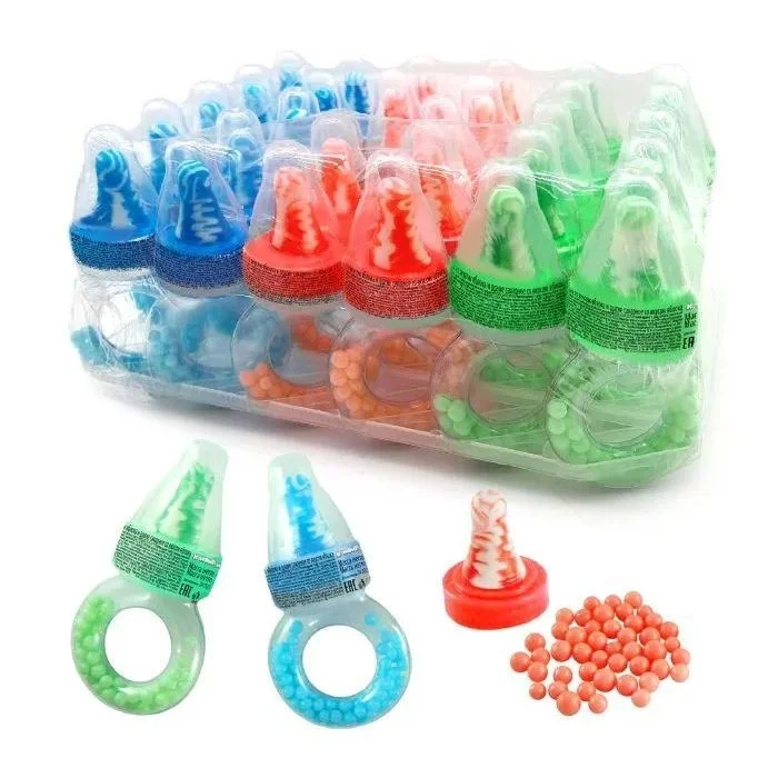 Сладкая погремушка 2 в 1 точно вызовет восторг у маленьких сладкоежек. На верху погремушки находится карамелька в форме соски, а вместо бусинок гремучий звук создают сладкие хрустящие горошины драже. Можно и лакомиться, и греметь погремушкой. В одном блоке три разных цвета и вкуса: виноград, клубника и яблоко.