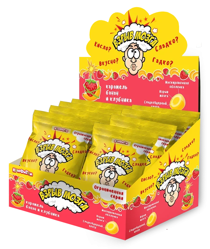Карамель Взрыв мозга кислая, 15 г – оригинальная конфета для быстрого перекуса во время прогулки, длительной поездки или обеденного перерыва. Под маскировочной оболочкой яркого цвета скрывается кисло-сладкий центр. Невероятный многослойный вкус помогает утолить чувство голода и наполнить организм энергией, чтобы взбодриться. Благодаря удобному формату кислую карамель можно взять с собой куда угодно, например, на работу, в школу или в дорогу. Это позволит всегда иметь под рукой источник хорошего настроения. Для продукта характерна высокая энергетическая ценность. В пакете пять конфет, каждая из которых имеет индивидуальную упаковку.