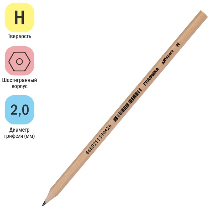 Чернографитный заточенный карандаш из натурального дерева. Отлично подходит для выполнения чертежных, технических, графических и художественных работ. Твердость H (Т), шестигранная форма корпуса цвета натурального дерева. Упаковка в картонную коробку с европодвесом, есть штрих-код на корпусе.