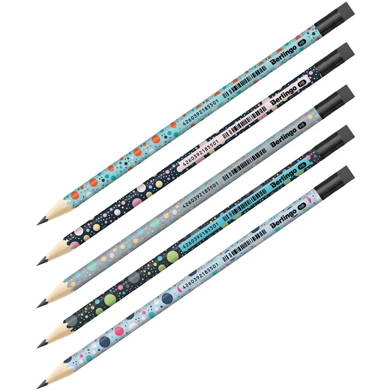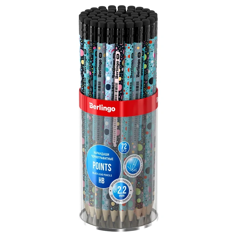 Чернографитный ударопрочный карандаш Berlingo 'Points' из липы, с заточкой и ластиком. Матовое покрытие корпуса, дизайны ассорти. Не ломается при падении. Подходит для черчения и рисования. Диаметр грифеля 2,2 мм, твердость HB, круглая форма, штрих-код на корпусе. Упаковка в прозрачную разъемную ПВХ-тубу с возможностью использования в качестве подставки.