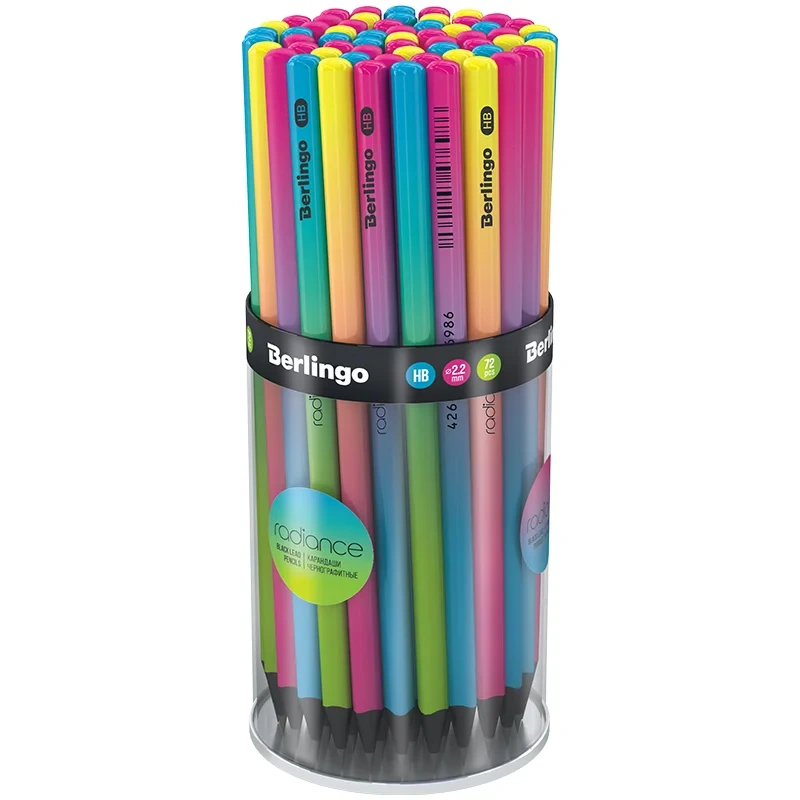 Чернографитный ударопрочный карандаш Berlingo 'Radiance' из черного дерева, с заточкой. Яркие высокоглянцевые дизайны ассорти в стиле градиент. Не ломается при падении. Закругленный, обработанный в цвет корпуса срез. Безопасен для детей. Подходит для черчения и рисования. Диаметр грифеля 2,2 мм, твердость HB, трехгранная форма, штрих-код на корпусе. Упаковка в прозрачную разъемную ПВХ-тубу с возможностью использования в качестве подставки.
