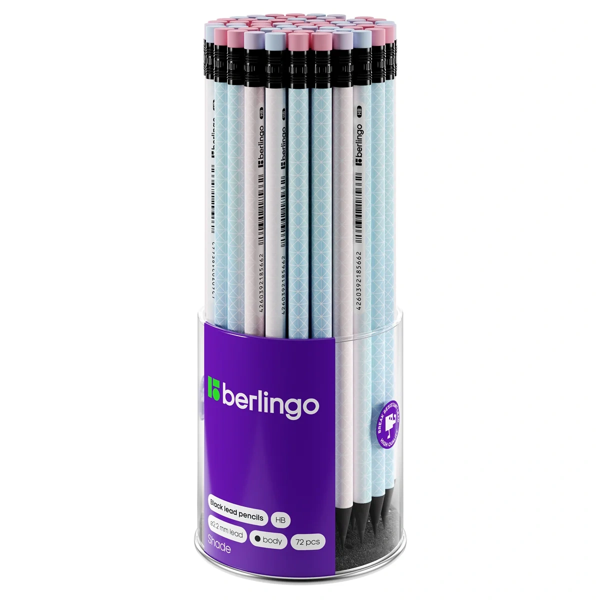 Чернографитный ударопрочный карандаш Berlingo 'Shade' из черного дерева, с заточкой и ластиком. Матовое покрытие корпуса, дизайны ассорти. Не ломается при падении. Подходит для черчения и рисования. Диаметр грифеля 2,2 мм, твердость HB, круглая форма, штрих-код на корпусе. Упаковка в прозрачную разъемную ПВХ-тубу с возможностью использования в качестве подставки.