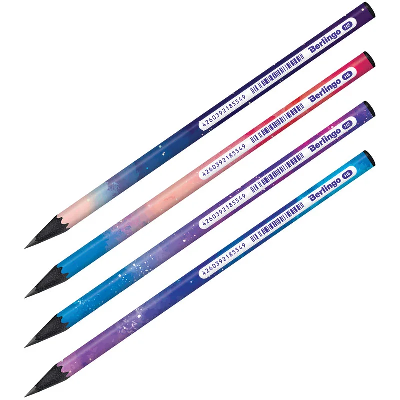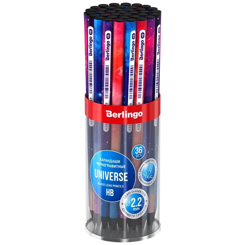 Чернографитный ударопрочный карандаш Berlingo 'Universe' из черного дерева, с заточкой. Матовое покрытие корпуса, дизайны ассорти. Не ломается при падении. Подходит для черчения и рисования. Диаметр грифеля 2,2 мм, твердость HB, круглая форма, штрих-код на корпусе. Упаковка в прозрачную разъемную ПВХ-тубу с возможностью использования в качестве подставки.