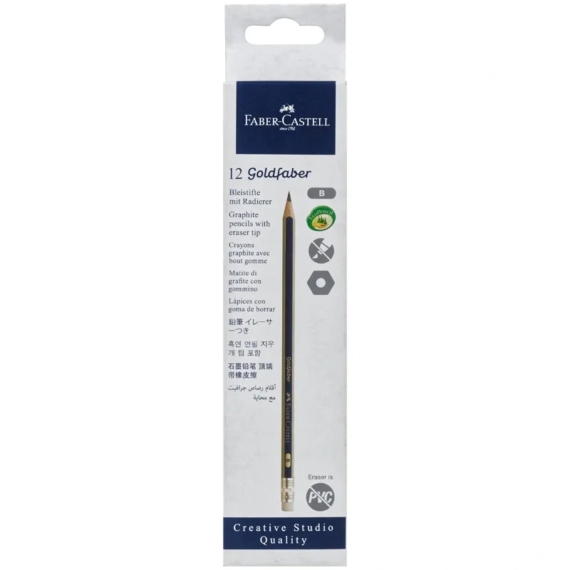 Чернографитный карандаш с ластиком Goldfaber 1222 от немецкого производителя Faber-Castell идеально подходит для рисования и скетчинга. Благодаря специальной технологии проклеивания грифеля (SV), грифель не ломается при падении и затачивании. Корпус карандаша имеет эргономичную шестигранную форму и удобен для длительного использования. Ластик не содержит ПВХ.