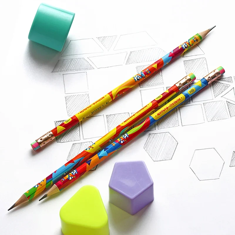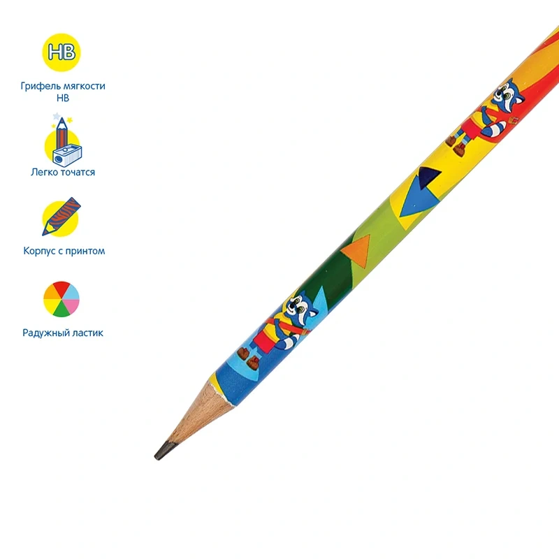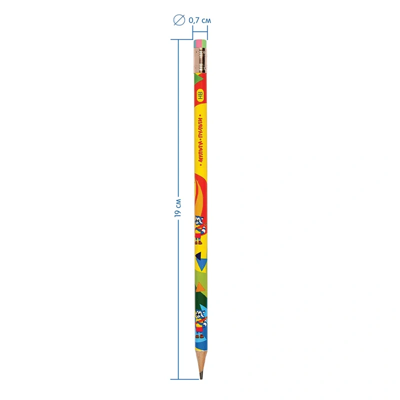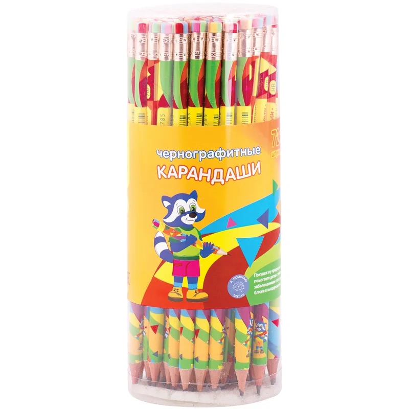 Чернографитный карандаш из липы, с ластиком, с заточкой. Подходит для черчения и рисования. Диаметр грифеля 2,2мм, твердость HB, круглая форма, штрих-код на корпусе. Цветная печать на корпусе в трех исполнениях. Упаковка в тубу по 72шт. Для детей старше 3-х лет.