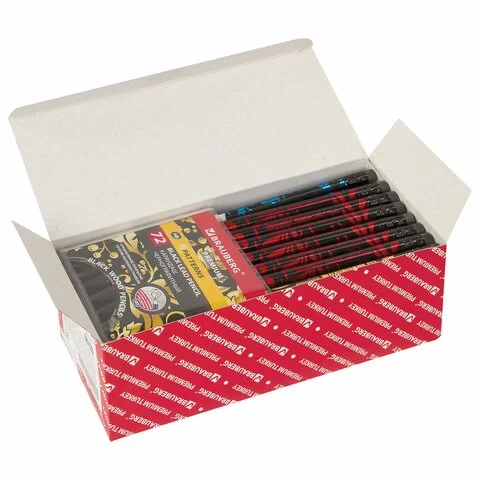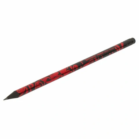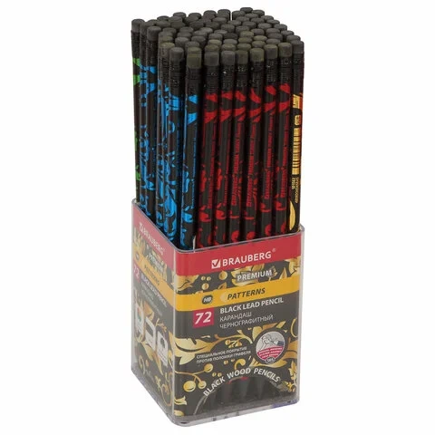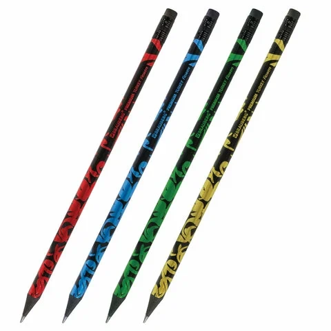 Каждый карандаш имеет индивидуальный штрих-код. Легко затачивается, максимально устойчив к повреждениям. Изготовлен из чёрного дерева высокого качества, оснащен ластиком. Имеет круглое сечение. Карандаш длиной 190 мм обладает средней степенью твердости – HB. Выполнен в черном цвете с цветными дизайнами. Поставляется заточенным в пластиковом стакане по 72 штуки.