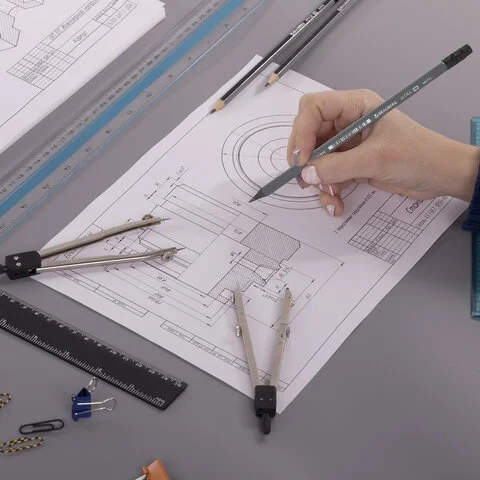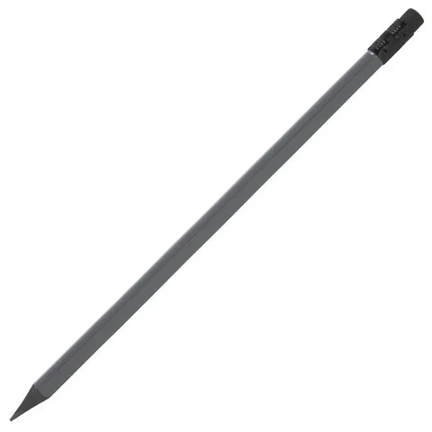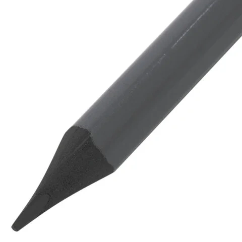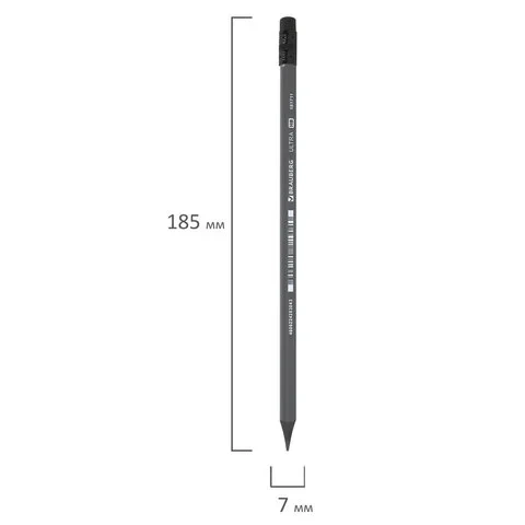 Каждый карандаш имеет индивидуальный штрих-код. Легко затачивается, максимально устойчив к повреждениям. Изготовлен из чёрного пластика высокого качества. Имеет трехгранное сечение и оснащен ластиком. Карандаш длиной 185 мм обладает средней степенью твердости – HB. Цвет корпуса - серый. Поставляется заточенным в пластиковой тубе по 72 штуки.