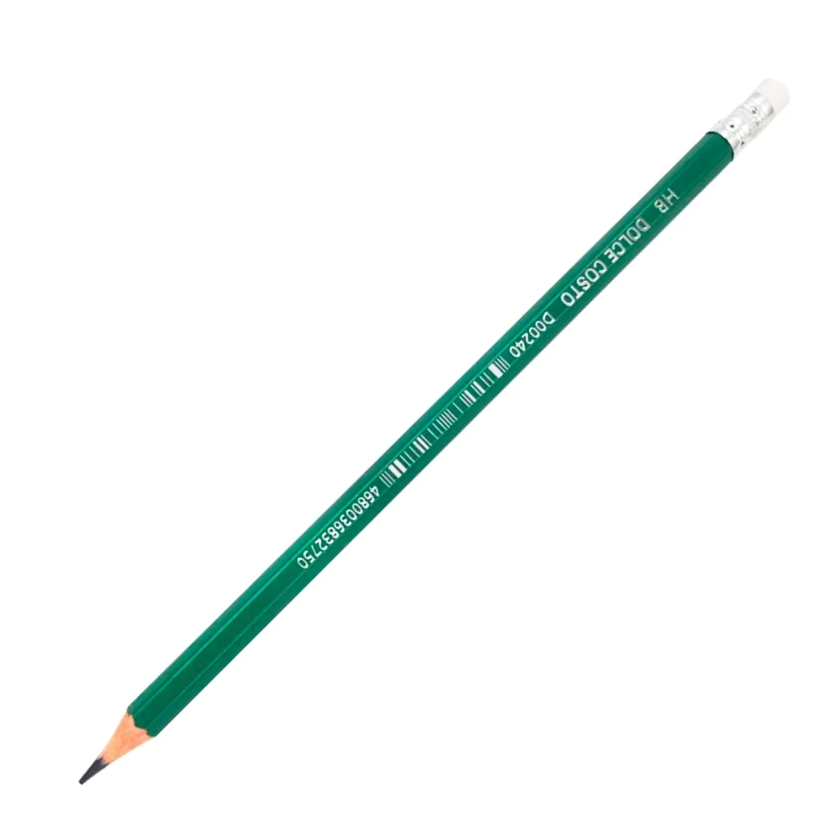 Карандаш DOLCE COSTO чернографитный, с ластиком, в шестигранном зеленом пластиковом корпусе, заточен, диаметр грифеля 2 мм, твердость грифеля HB.