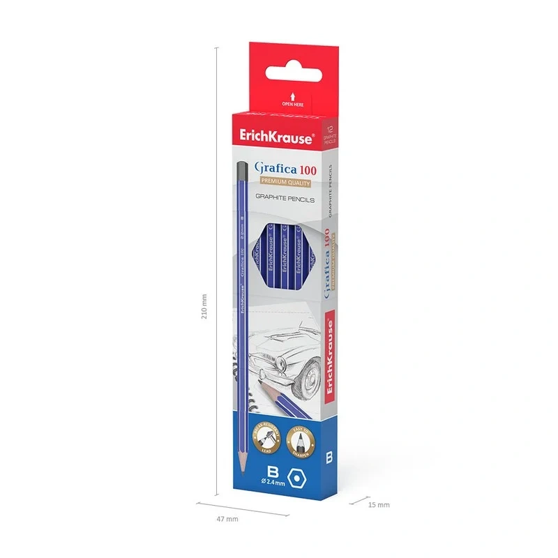 Классический шестигранный чернографитный карандаш из отборной древесины, твердость В. Специальная пропитка древесины и сплошная проклейка грифеля обеспечивает высокую ударопрочность. Мягкая древесина и идеальная центровка грифеля гарантируют легкую заточку с экономным расходом карандаша. Грифель диаметром 2,2 мм не царапает бумагу и не крошится.