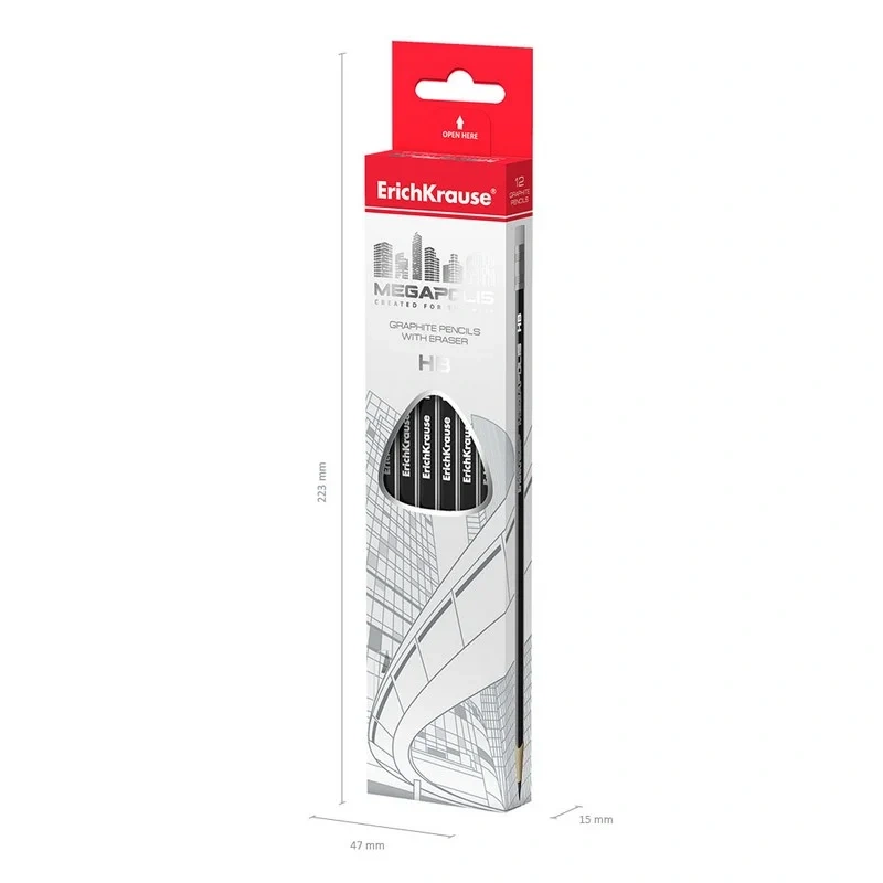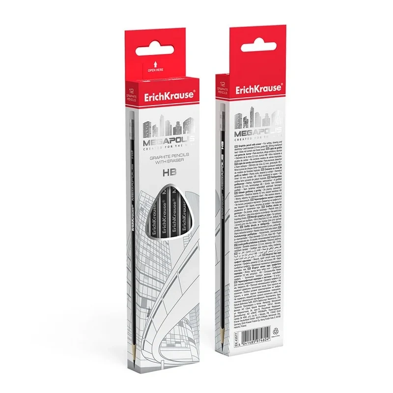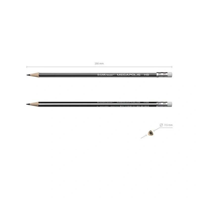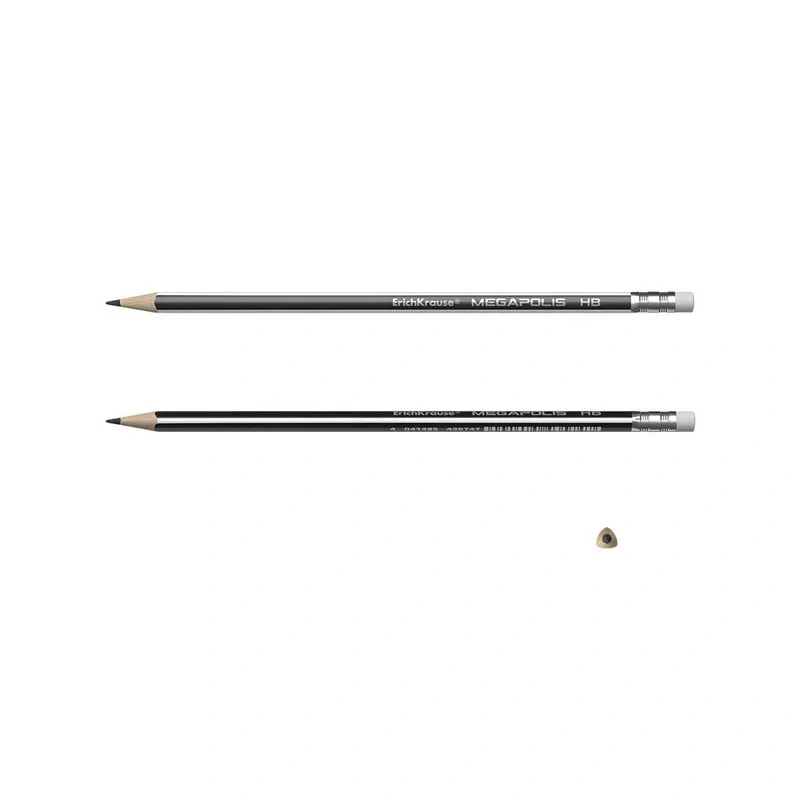 Карандаш чернографитный ErichKrause MEGAPOLIS HB трехгранный с ластиком