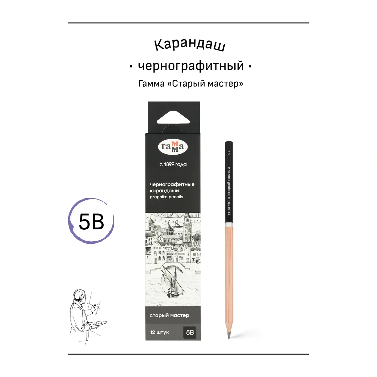 Чернографитные карандаши ГАММА серии «Старый мастер» твёрдостью 5B предназначены для рисования, скетчинга и черчения на бумаге и картоне. Диаметр грифеля – 2,8 мм. Карандаши «Старый мастер» выпускаются в 20 различных степенях твердости: от 8H до 10B, поэтому идеально подойдут как для художников, иллюстраторов, так и для архитекторов и инженеров. Карандаши упакованы в картонную коробку по 12 штук.