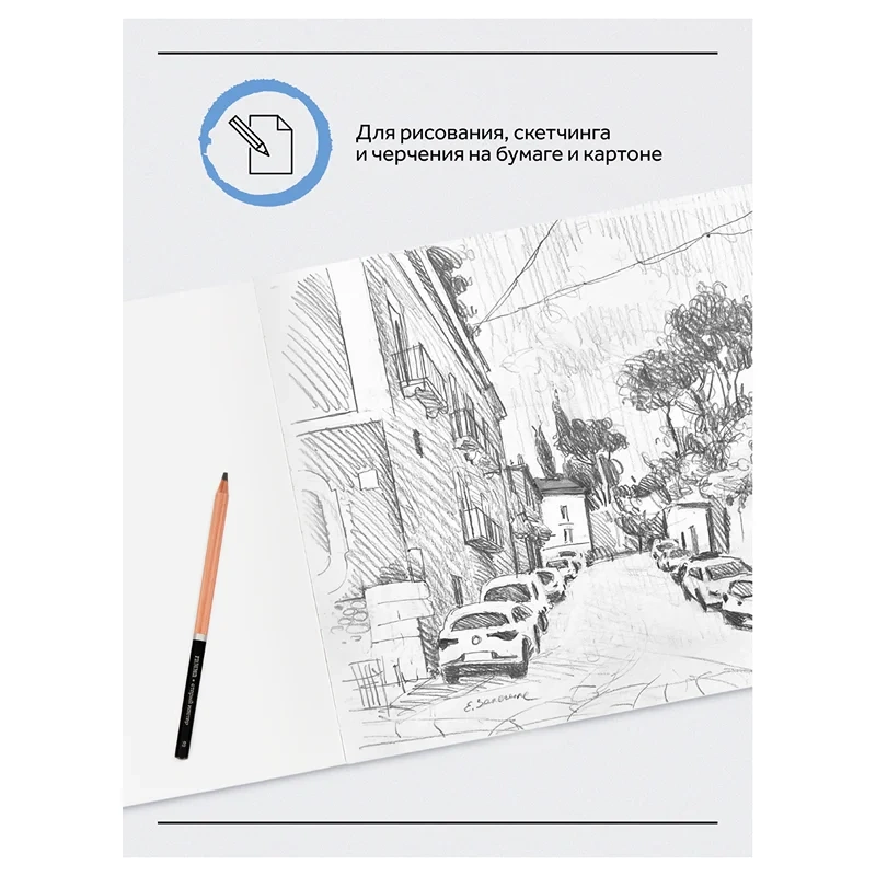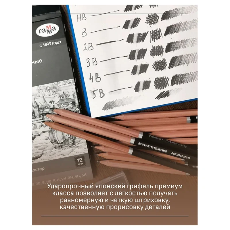 В карандашах ГАММА используется японский грифель премиум-класса, который позволяет с легкостью получать равномерную и четкую штриховку, качественную прорисовку деталей. Разные степени твердости помогают с легкостью передать темные, средние и светлые тона, варьировать толщину линии. Благодаря специальной равномерной проклейке грифеля в несколько этапов карандаши не крошатся и не ломаются даже после падения.