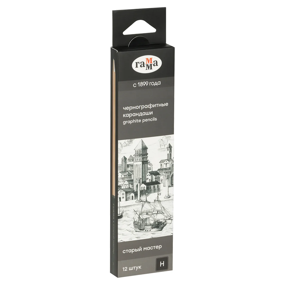 Чернографитные карандаши ГАММА серии «Старый мастер» твёрдостью H предназначены для рисования, скетчинга и черчения на бумаге и картоне. Диаметр грифеля – 2 мм. Карандаши «Старый мастер» выпускаются в 20 различных степенях твердости: от 8H до 10B, поэтому идеально подойдут как для художников, иллюстраторов, так и для архитекторов и инженеров. Карандаши упакованы в картонную коробку по 12 штук.