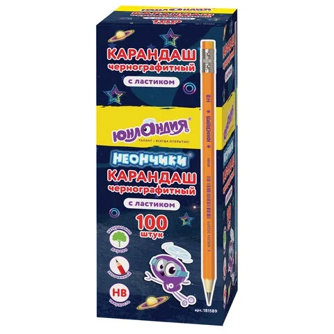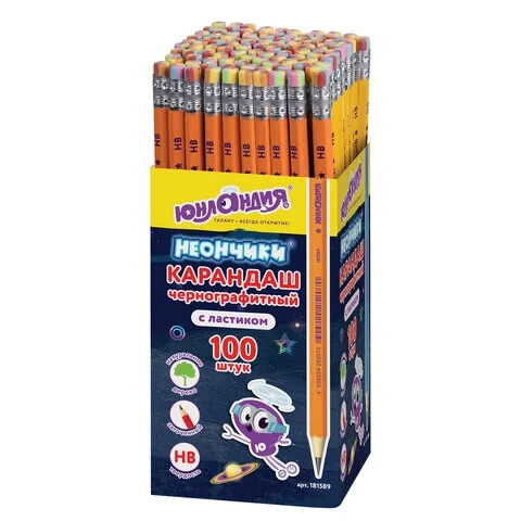Карандаш чернографитный ЮНЛАНДИЯ, 1 шт., 'Неончики', НВ, корпус ассорти, с резинкой, 181589