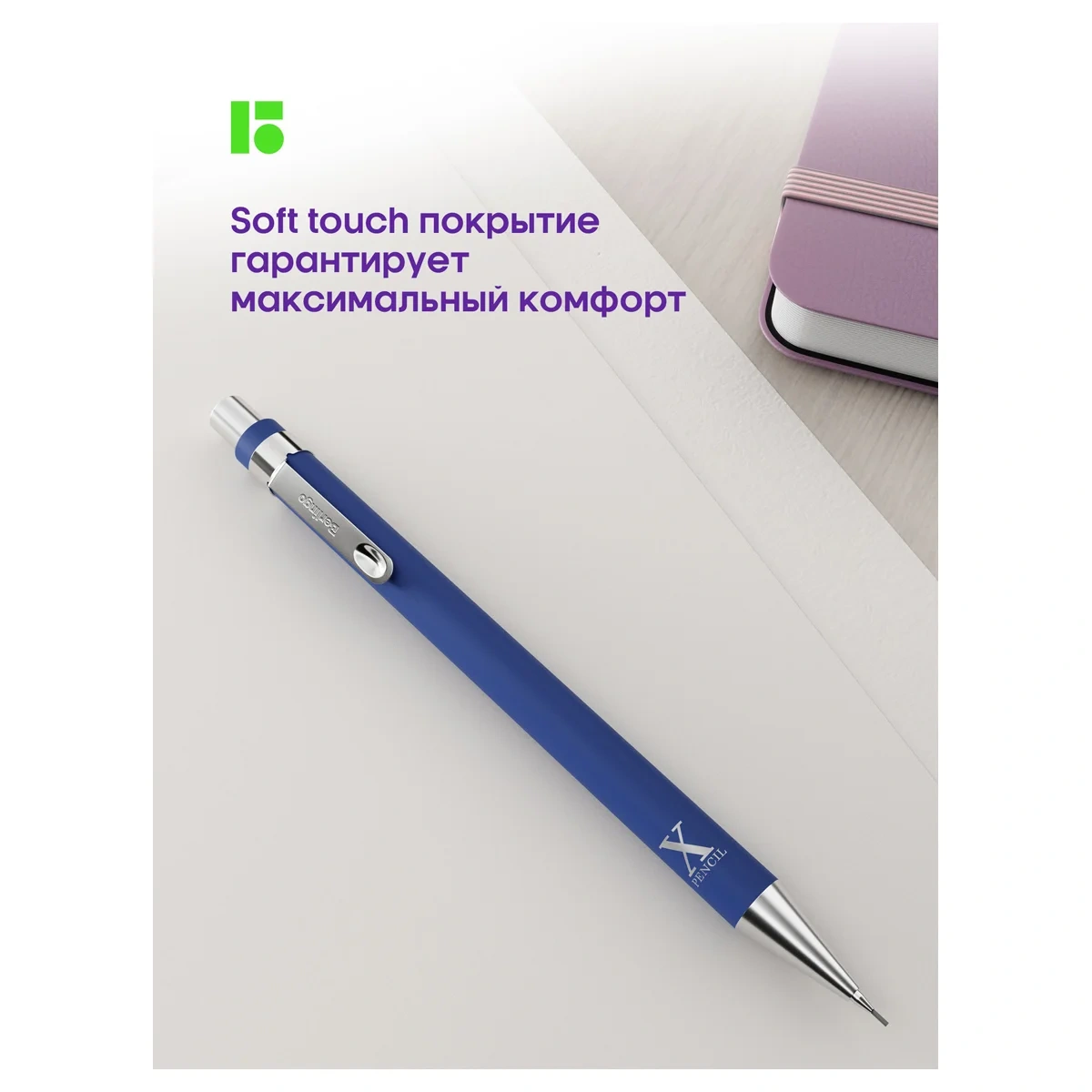 Механический карандаш с металлическим клипом и хромированным элементами. Отличается элегантным дизайном. Корпус с покрытием soft touch выполнен в четырёх стильных цветах – чёрном, белом, тёмно-синем и розовом. 40 штук в пластиковом стакане. Диаметр грифеля - 0,5 мм. Твёрдость - HB. Снабжён двумя запасными грифелями и встроенным ластиком. Материал корпуса – прорезиненный пластик. Направляющий механизм грифеля выполнен из металла. Подача грифеля осуществляется с помощью кнопочного механизма.