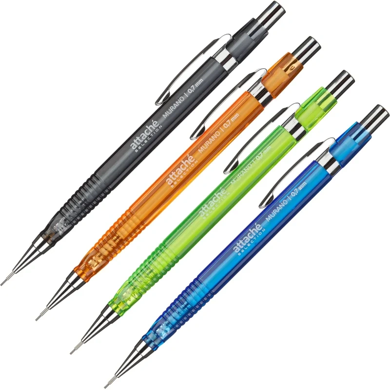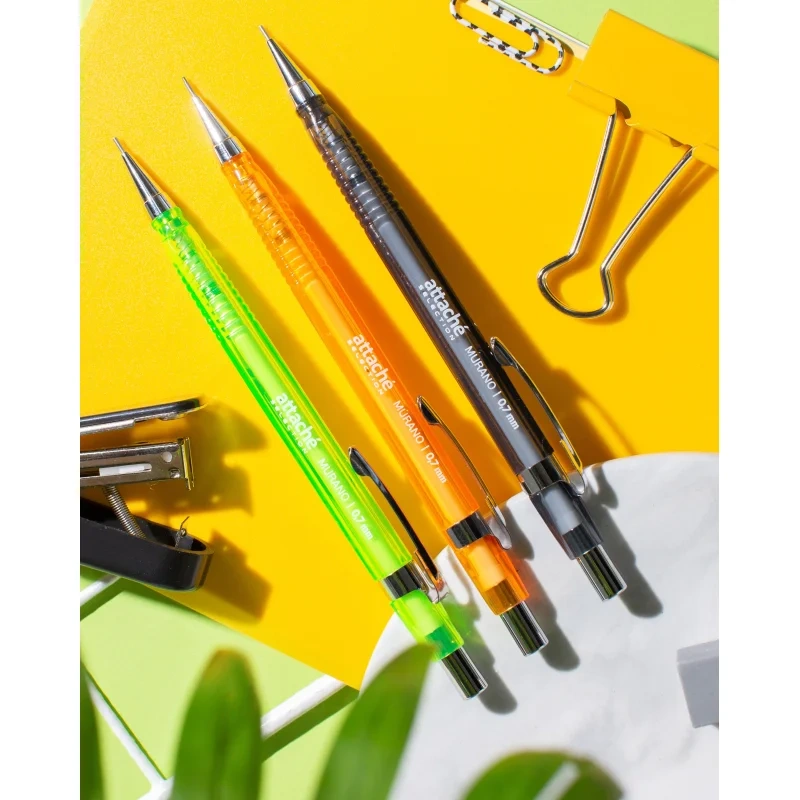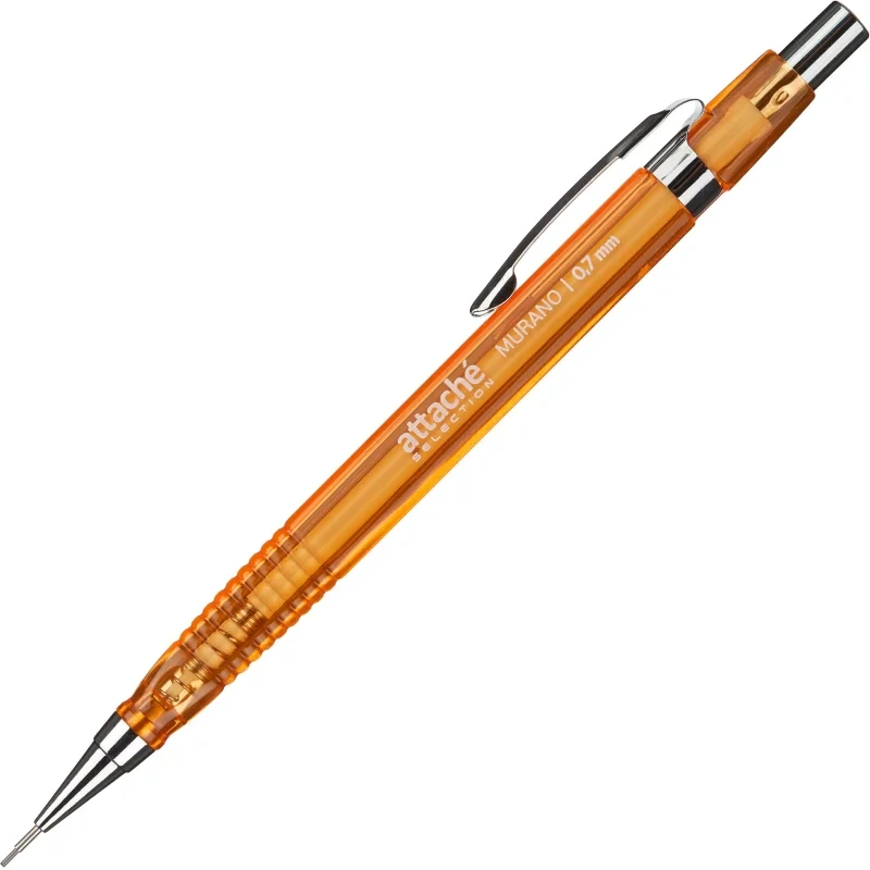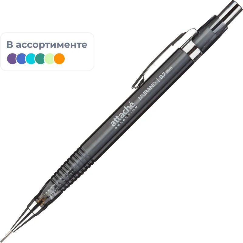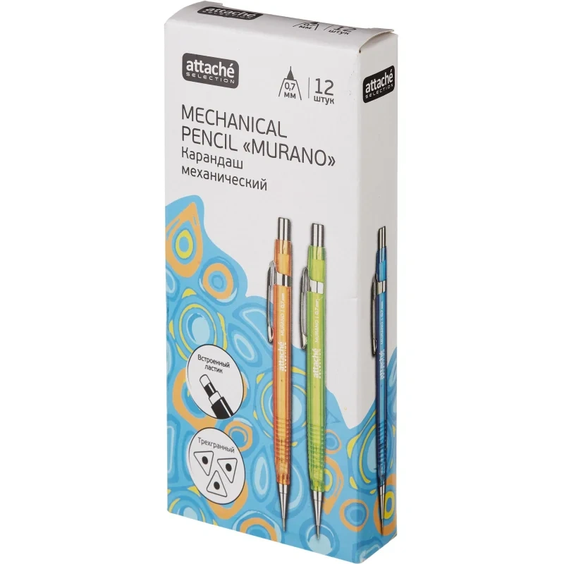 Карандаш механический Attache Selection Murano с толщиной линии письма 0,7 мм., твердость грифеля НВ. Является отличным помощником в работе над документами и текстами, для рисования, для проведения проектных работ и работ по черчению. Карандаш механический обладает металлическим наконечником, клипом и ластиком. Предназначен для рисования, черчения и письма. Карандаш выполнен в прозрачном тонированном пластиковом корпусе, цвет корпуса поставляется в ассортименте (без возможности выбора).