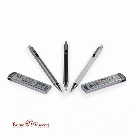 Корпус круглой формы с 16-ю гранями, можно сказать, что это граненый карандаш. Наконечник металлический и хромированный – это традиционная деталь механических карандашей Bruno Visconti. У подающей цанги 3 широких металлических лепестка для удобного захвата и подачи грифеля – карандаш с такой конструкцией прослужит долго.