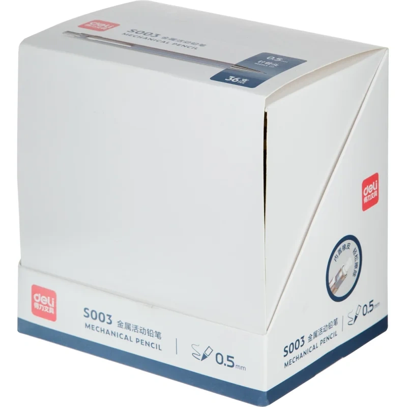 Механический карандаш Deli предназначен для работы над текстами, для рисования, проектных работ и черчения. Толщиной грифеля 0.5 мм, твердость — HB. Карандаш выполнен в металлическом корпусе. Карандаш механический обладает металлическим наконечником, клипом и встроенным ластиком. Тип подачи грифеля карандаша — кнопочный.