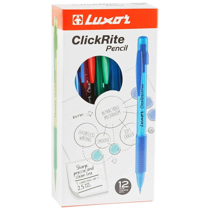Механический карандаш Luxor 'ClickRite' - автоматический крандаш с грипом и ластиком на конце. Рифленый мягкий грип не позволяет карандашу выскальзывать из пальцев руки. Тонированные цвета корпуса ассорти: красный, оранжевый, синий, зеленый. Диаметр пишущего узла - 0,5 мм. Механический карандаш Luxor 'ClickRite' - это мягкие и тонкие линии письма при минимальном нажатии