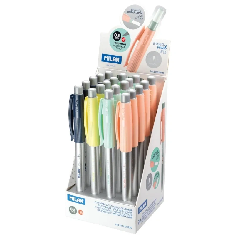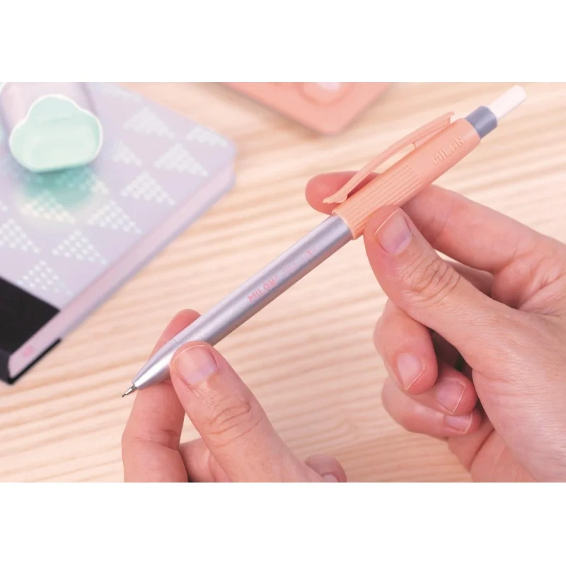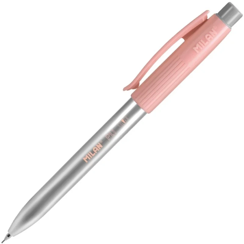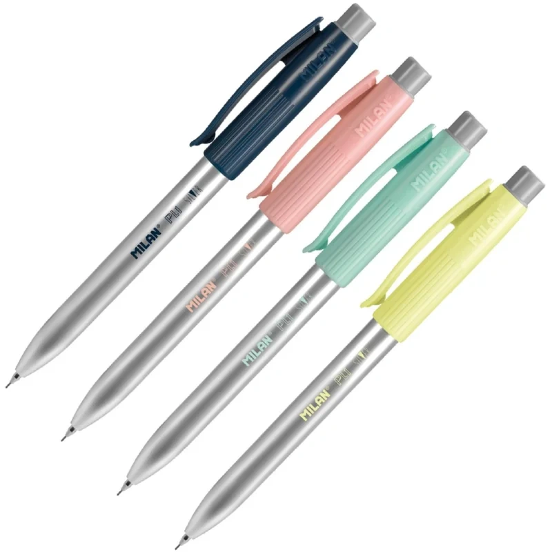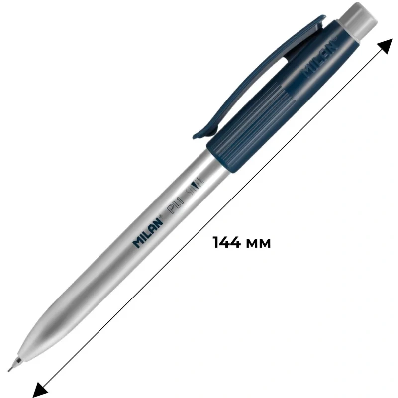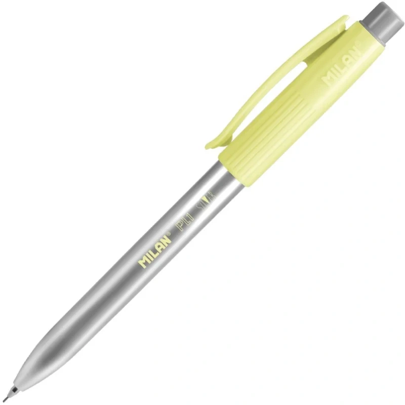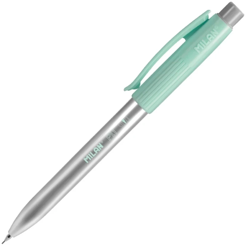 Карандаш механический Milan с оригинальным корпусом с выкручивающимся достаточно длинным ластиком, коллекция PL1 Silver. Цвет корпуса металлик в сочетании с темно-синим, желтым, салатовым или розовым цветом клипа. Толщина грифеля 0,5 мм, твердость HB. Размеры карандаша: 14,4?1,5?1,1 см.