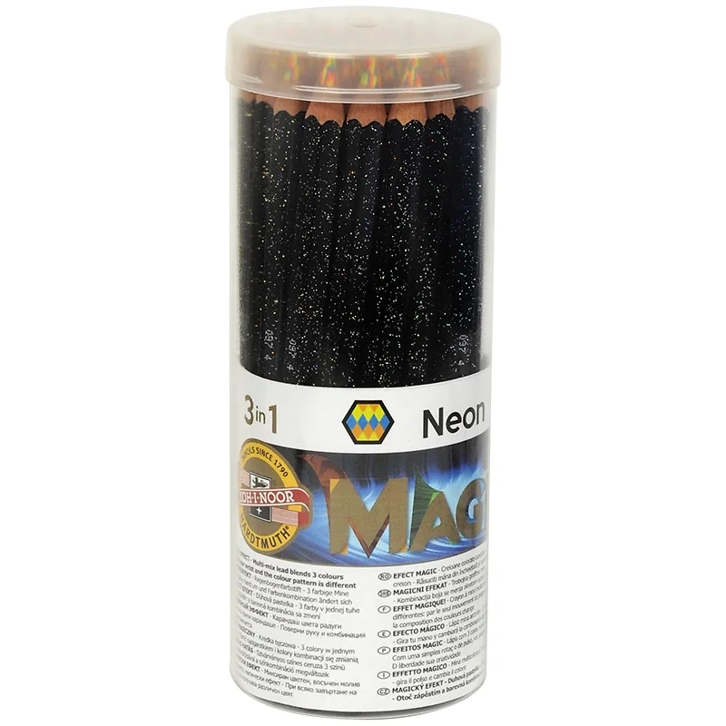 Карандаш многоцветный Koh-i-Noor Magic Neon интересен тем, что грифель смешан из трех цветов. Линия на бумаге меняет свой цвет в процессе рисования и раскрашивания, что позволяет получать совершенно неожиданные и никогда не повторяющиеся рисунки. В данном карандаше смешаны три неоновых грифеля, которые оставляют одинаково яркий след как на белой, так и на темной бумаге. Карандаши мягкие и не требуют сильного надавливания при рисовании.