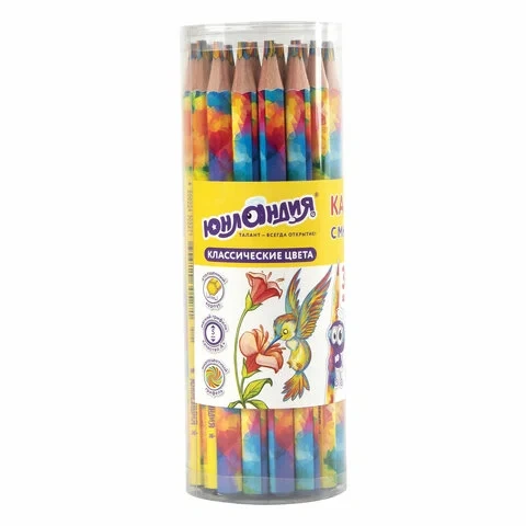 Необычный грифель карандаша сочетает в себе четыре цвета - желтый, красный, голубой, зелёный. Утолщенный шестигранный корпус позволяет не скатываться карандашу с поверхности стола во время занятий рисованием и комфортно располагается в руке ребенка. Карандаш изготовлен из высококачественной древесины. Корпус покрыт цветной печатью. Мягкий грифель диаметром 5 мм из натуральных материалов и пигментов обладает повышенной прочностью. Карандаши упакованы в пластиковую прозрачную тубу с красочным стикером.
