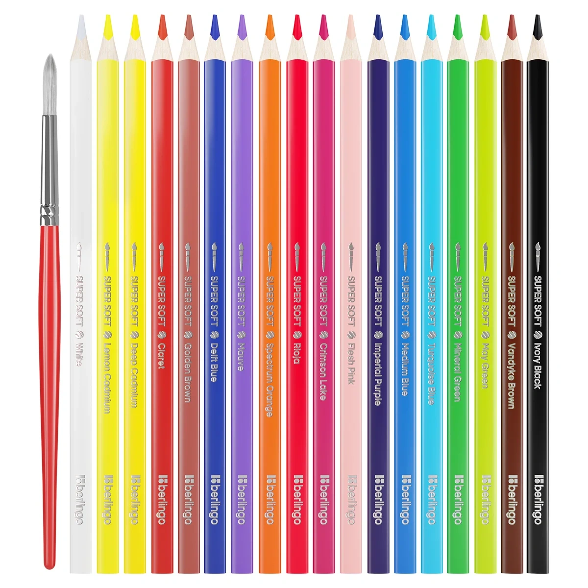 'SuperSoft' - линейка качественно новых цветных карандашей Berlingo. Акварельные карандаши Berlingo обладают идеальной растворимостью, отличной смешиваемостью, мягким письмом и яркими красками. 18 цветов. Кисть в комплекте. Эргономичная трехгранная форма. Указание цвета на каждом карандаше на английском языке. Поле для подписи имени владельца на каждом карандаше. Упаковка в плотную матовую картонную коробку со склеенным европодвесом. Пластиковый трей внутри предотвращает скатывание карандашей и позволяет легко собирать их в коробку.
