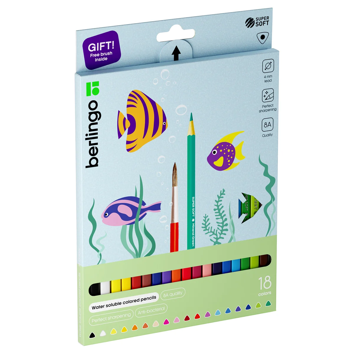 Карандаши акварельные Berlingo 'SuperSoft. Рыбки', 18цв.+кисть, трехгран., заточен., картон, европод