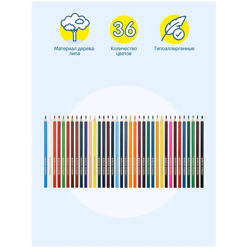 В наборе 36 цветов, диаметр грифеля составляет 3,3 мм, что увеличивает срок службы карандаша. Карандаши упакованы в картонную коробку с глянцевой ламинацией и европодвесом. Товар предназначен для детей старше 3-х лет.
