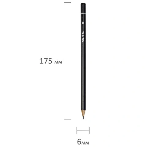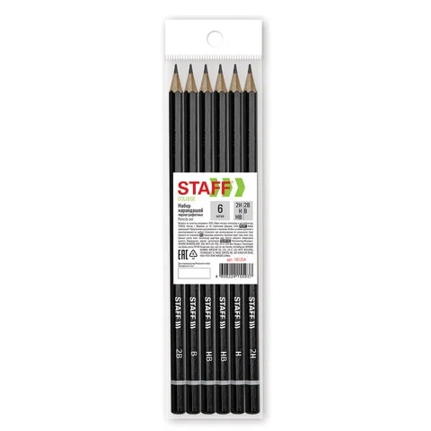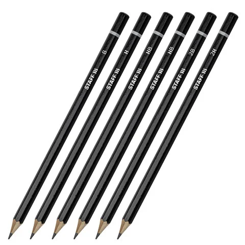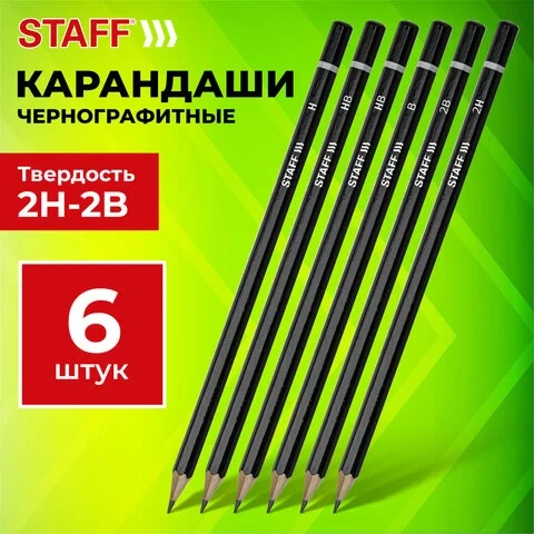 Карандаши чернографитные STAFF, НАБОР 6 шт., 2H-2B, без резинки, черный корпус, заточенные, 181254