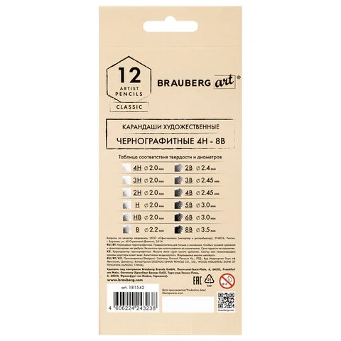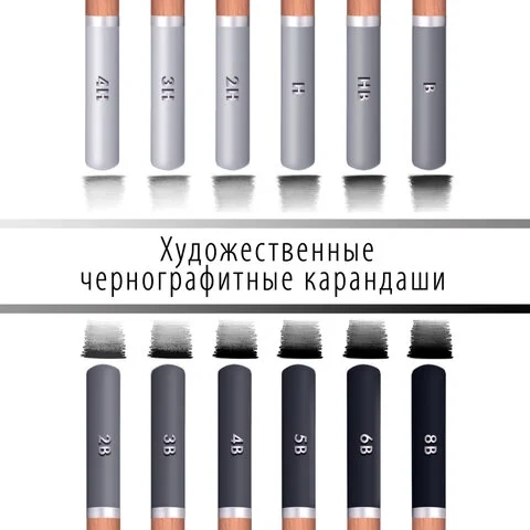 Карандаши художественные чернографитные 4H-8B, НАБОР 12 штук, BRAUBERG ART 'CLASSIC', 181542