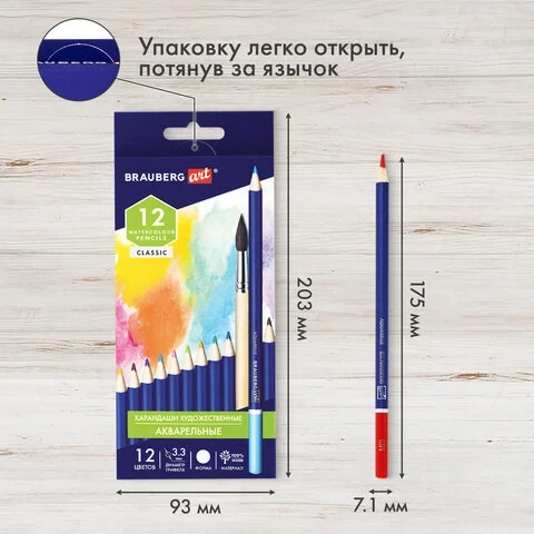 Карандаши художественные цветные акварельные BRAUBERG ART CLASSIC, 12 цветов, грифель 3,3 мм, 181529