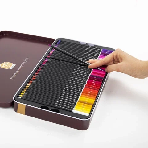 Набор состоит из 120 ярких цветов. Круглая форма сечения и матовый корпус позволяют удобно держать карандаши в руке. Древесина ценных пород и качество исполнения гарантируют легкую заточку. Благодаря высококачественному грифелю диаметром 4,0 мм рисунок ложится густой и четкой линией, обеспечивая бархатистую поверхность. Мягкий грифель дает мягкость нанесения и насыщенные цвета, позволяя легко смешивать различные оттенки. Все карандаши заточены и поставляются в металлическом пенале.