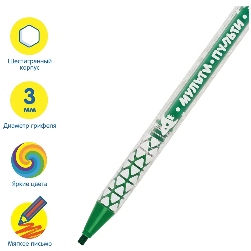 Карандаши акварельные механические от Мульти-Пульти - отличное решение для творческих экспериментов ребенка. Благодаря механическому узлу карандаша грифель можно выдвинуть нажатием на кнопку, точилка для такого карандаша не требуется. Грифель толщиной 3мм обладает акварельным эффектом - это значит, что карандаш можно использовать не только для обычного рисования, но и применяя акварельные техники. Нарисованный рисунок можно размыть водой, получив эффект акварели, кисть входит в состав набора. Также можно рисовать по мокрой бумаге или намочив грифель в воде. Для стартовых экспериментов в набор включены 5 листов для раскрашивания.