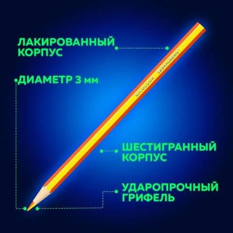 Шестигранная форма корпуса позволяет карандашу не скатываться с поверхности стола во время занятий рисованием. Карандаши изготовлены из древесины ценных пород и имеют лакированный корпус. Высокосортная древесина и качество исполнения гарантируют легкую заточку. Грифель диаметром 3 мм обладает повышенной прочностью. Благодаря двухцветной компоновке грифеля цвета можно использовать не только по отдельности, но и создавать волшебные двухцветные штрихи. Все карандаши заточены и поставляются в картонной упаковке с европодвесом.