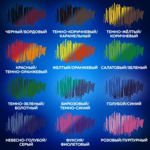 В наборе 12 двухцветных карандашей и 24 цвета: черный/бордовый, темно-коричневый/карамельный, темно-жёлтый/коричневый, красный/темно-оранжевый, желтый/оранжевый, салатовый/зеленый, темно-зеленый/болотный, бирюзовый/темно-синий, голубой/синий, небесно-голубой/серый, фуксия/фиолетовый, розовый/пурпурный.