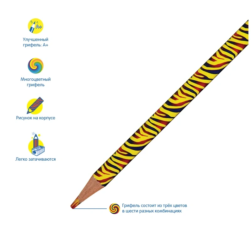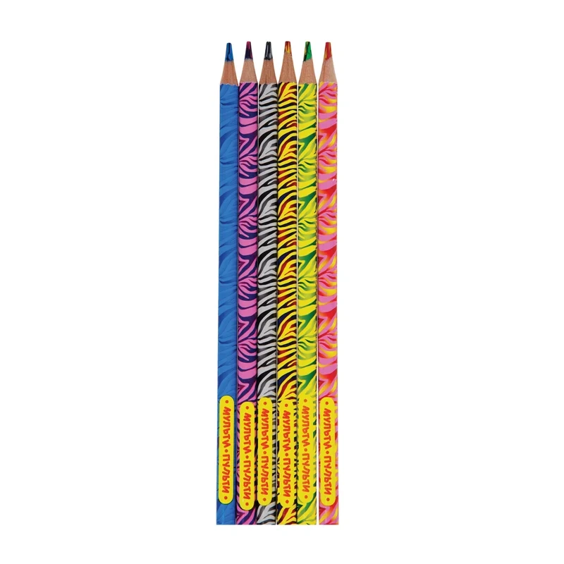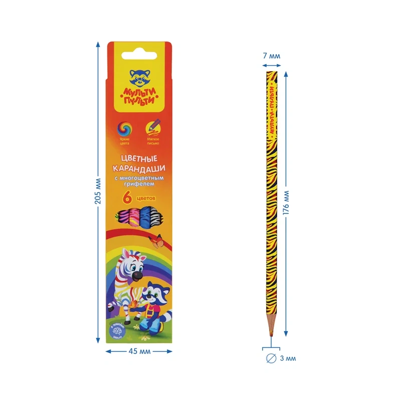 Набор карандашей с многоцветными грифелями, грифель каждого карандаша состоит из трех цветов в шести разных комбинациях. Супермягкий грифель, яркие насыщенные цвета. Круглая форма корпуса с рисунком, легко затачиваются. Набор позволяет рисовать всеми цветами радуги, создавая неповторимые и удивительные рисунки. Для детей старше 3-х лет.
