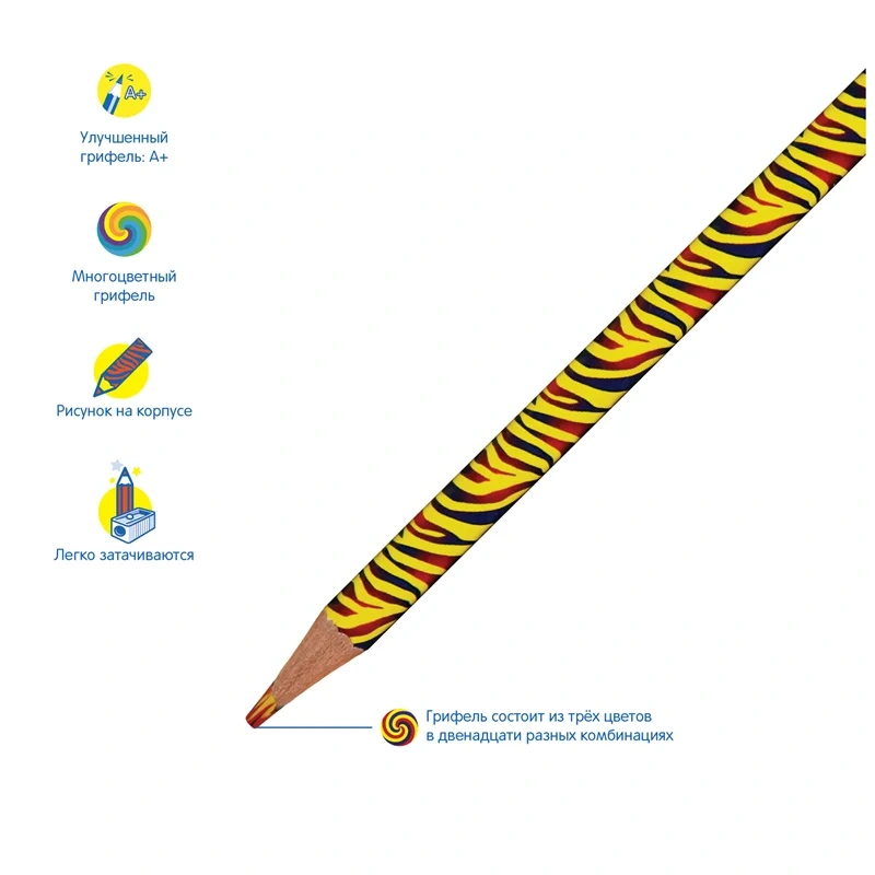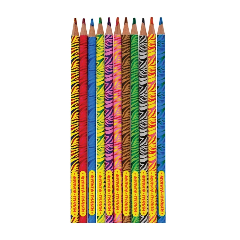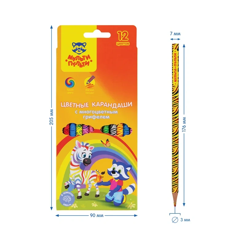 Набор карандашей с многоцветными грифелями, грифель каждого карандаша состоит из трех цветов в двенадцати разных комбинациях. Супермягкий грифель, яркие насыщенные цвета. Круглая форма корпуса с рисунком, легко затачиваются. Набор позволяет рисовать всеми цветами радуги, создавая неповторимые и удивительные рисунки. Для детей старше 3-х лет.