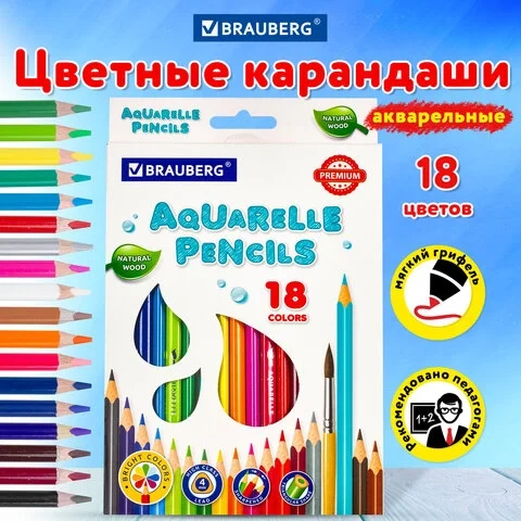 Карандаши цветные акварельные BRAUBERG PREMIUM AQUARELLE, 18 цветов, грифель мягкий 4 мм, 181672