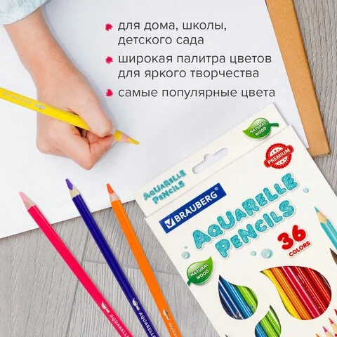 Карандаши цветные акварельные BRAUBERG PREMIUM AQUARELLE, 36 цветов, грифель мягкий 4 мм, 181674