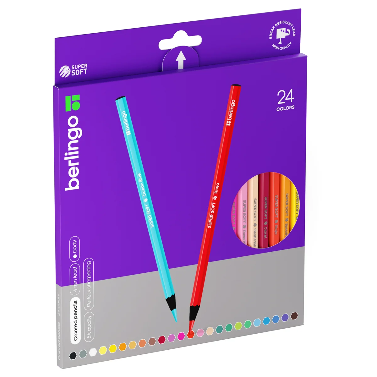 'SuperSoft' - линейка качественно новых цветных карандашей Berlingo. 24 цвета. Черное дерево. Шестигранная форма. Указание цвета на каждом карандаше на английском языке. Поле для подписи имени владельца на каждом карандаше. Упаковка в плотную матовую картонную коробку со склеенным европодвесом.