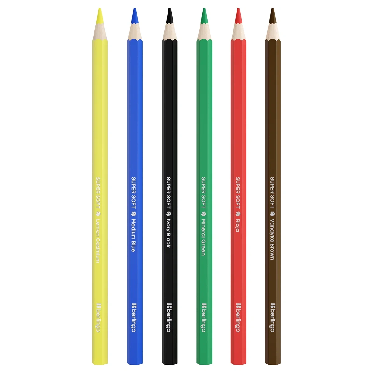 'SuperSoft' - линейка качественно новых цветных карандашей Berlingo. 6 цветов. Шестигранная форма. Указание цвета на каждом карандаше на английском языке. Поле для подписи имени владельца на каждом карандаше. Упаковка в плотную матовую картонную коробку со склеенным европодвесом.