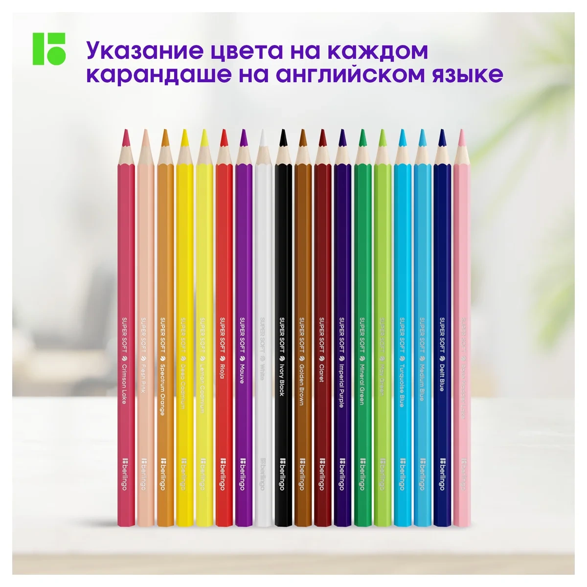 'SuperSoft' - линейка качественно новых цветных карандашей Berlingo. 18 цветов. Шестигранная форма. Указание цвета на каждом карандаше на английском языке. Поле для подписи имени владельца на каждом карандаше. Упаковка в плотную матовую картонную коробку со склеенным европодвесом.