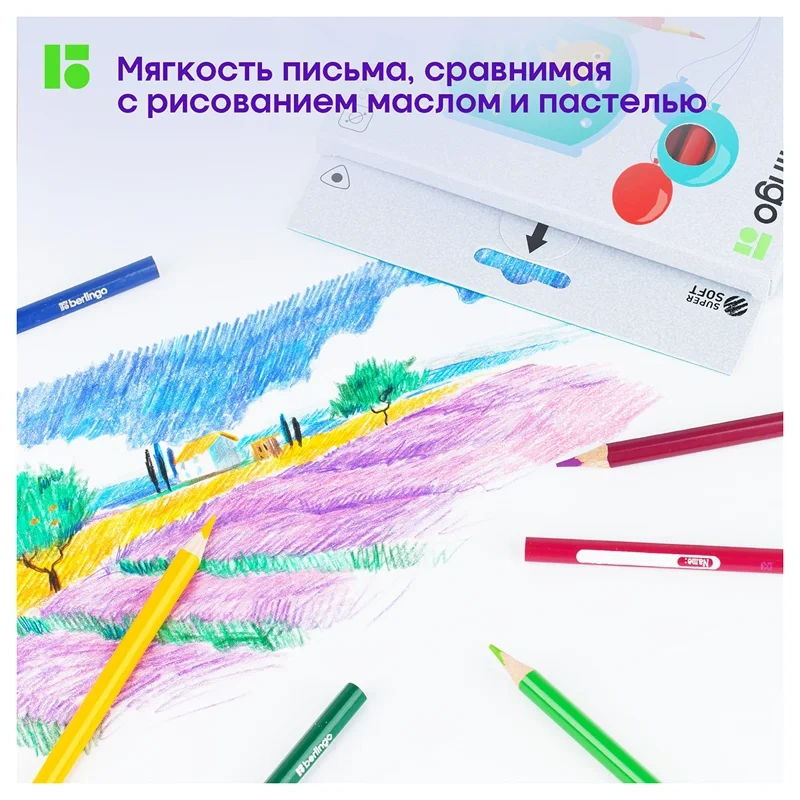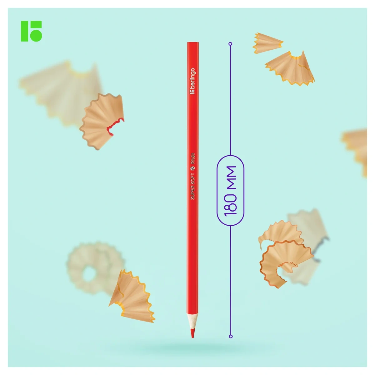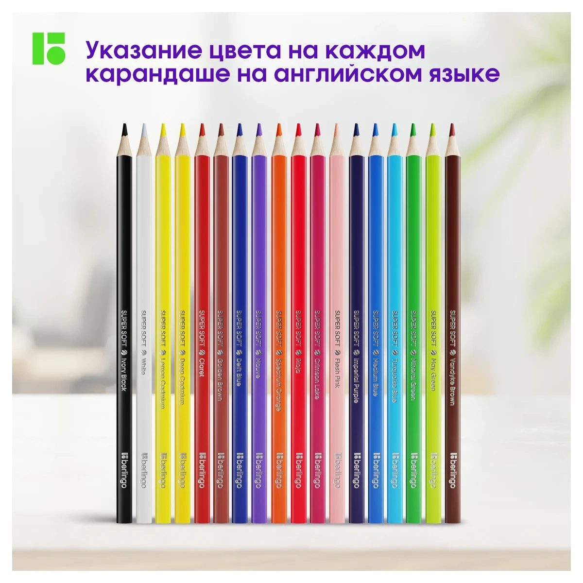 'SuperSoft' - линейка качественно новых цветных карандашей Berlingo. 18 цветов. Эргономичная трехгранная форма. Указание цвета на каждом карандаше на английском языке. Поле для подписи имени владельца на каждом карандаше. Упаковка в плотную матовую картонную коробку со склеенным европодвесом. Пластиковый трей внутри предотвращает скатывание карандашей и позволяет легко собирать их в коробку.