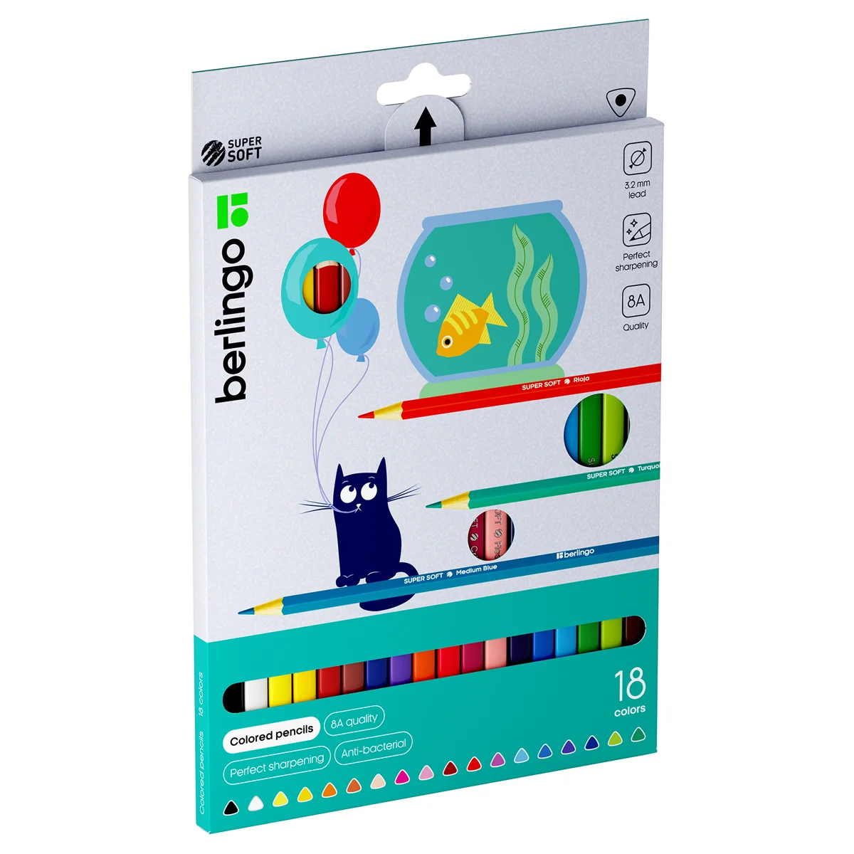 Карандаши цветные Berlingo 'SuperSoft. Жил-был кот', 18цв., трехгран., заточен., картон, европодвес