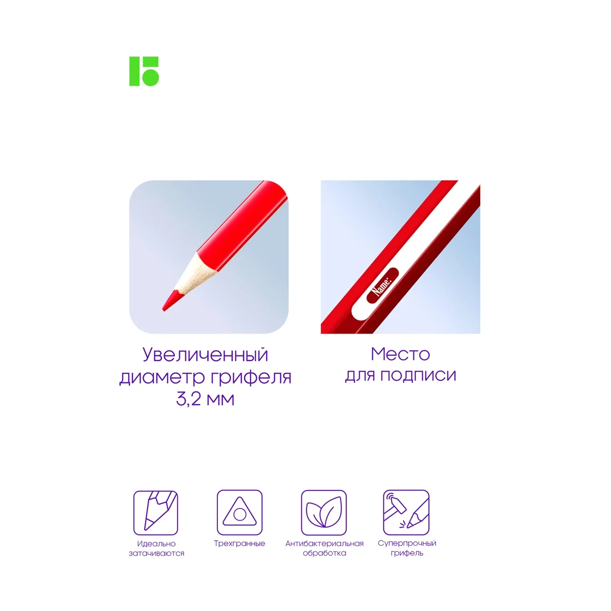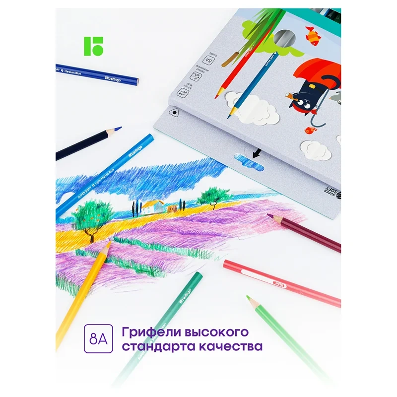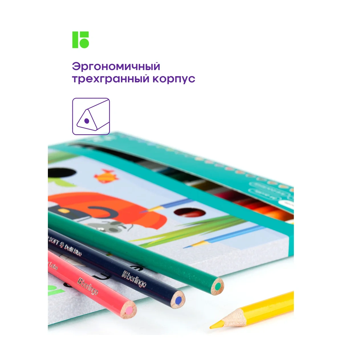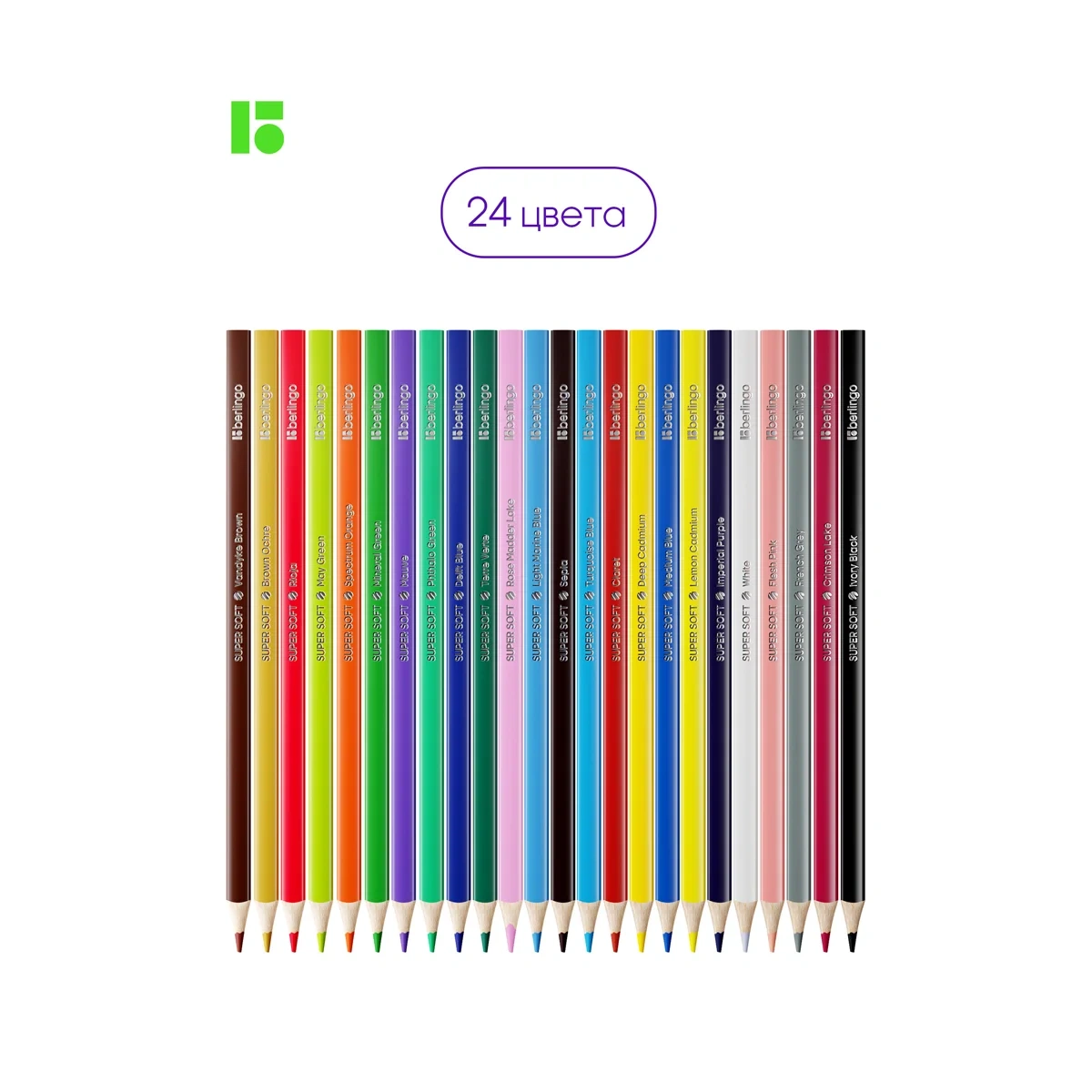 'SuperSoft' - линейка качественно новых цветных карандашей Berlingo. 24 цвета. Эргономичная трехгранная форма. Указание цвета на каждом карандаше на английском языке. Поле для подписи имени владельца на каждом карандаше. Упаковка в плотную матовую картонную коробку со склеенным европодвесом. Пластиковый трей внутри предотвращает скатывание карандашей и позволяет легко собирать их в коробку.