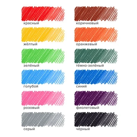 В наборе 12 цветов: черный, синий, голубой, салатовый, зеленый, желтый, оранжевый, розовый, красный, серый, фиолетовый, коричневый.