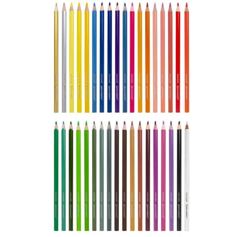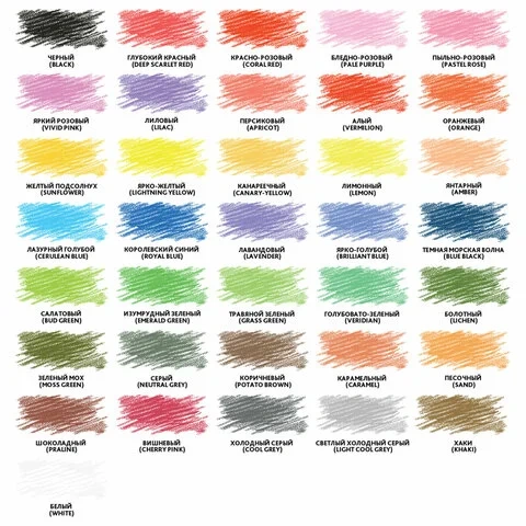 Набор состоит из 36 цветов: темно-синий, синий, фиолетовый, сиреневый, пурпурный, коралловый, розовый, бежевый, бледно-розовый, бордовый, красный, алый, темно-оранжевый, канареечный, оранжевый, желтый, бледно-желтый, белый, серебристый, золотистый, черный, серый, темно-зеленый, болотный, зеленый, бирюзовый, салатовый, бледно-зеленый, светло-серый, темно-коричневый, коричневый, каштановый, светло-коричневый, песочный, голубой, синий. Трехгранная форма сечения корпуса позволяет не скатываться карандашу с поверхности стола во время занятий рисованием. Они изготовлены из древесины ценных пород и имеют лакированный корпус. Высокосортная древесина и качество исполнения гарантируют легкую заточку. Грифель диаметром 3,3 мм обладает повышенной прочностью. Все карандаши заточены и поставляются в картонной упаковке с европодвесом.