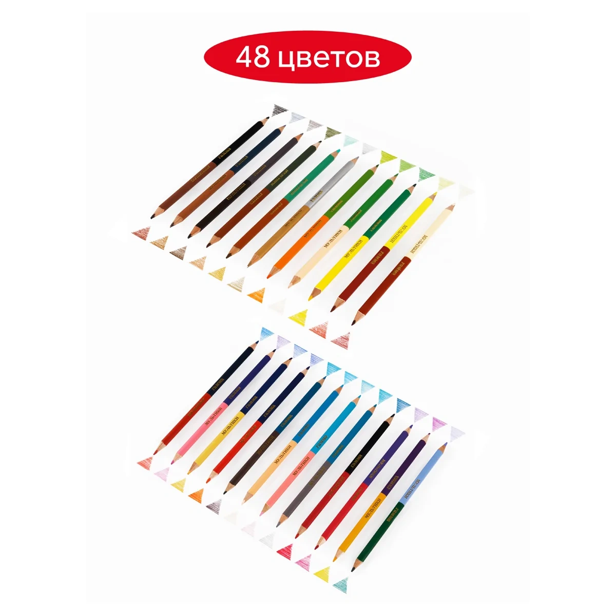 Двусторонние цветные карандаши ГАММА серии «Мультики» помогут экономить место в пенале и получить в 2 раза больше цветов. В наборе 24 карандашей и 48 цветов. Диаметр грифеля — 2,9 мм. Проклеенный ударопрочный грифель не крошится во время заточки и не ломается даже после падения. Корпус карандаша диаметром 7 мм и длиной 174 мм изготовлен из дерева. Эргономичный трехгранный корпус позволяет удобно располагать карандаш в детской руке и предотвращает его скатывание со стола. Специальная обработка натуральной древесины позволяет легко заточить карандаш без зазубрин и заноз. За яркость и высокую укрывистость отвечают качественные пигменты в составе. Ребенку не придется сильно давить на карандаш — рисунок получится ярким и равномерно закрашенным. Упаковка – картонная коробка с европодвесом.
